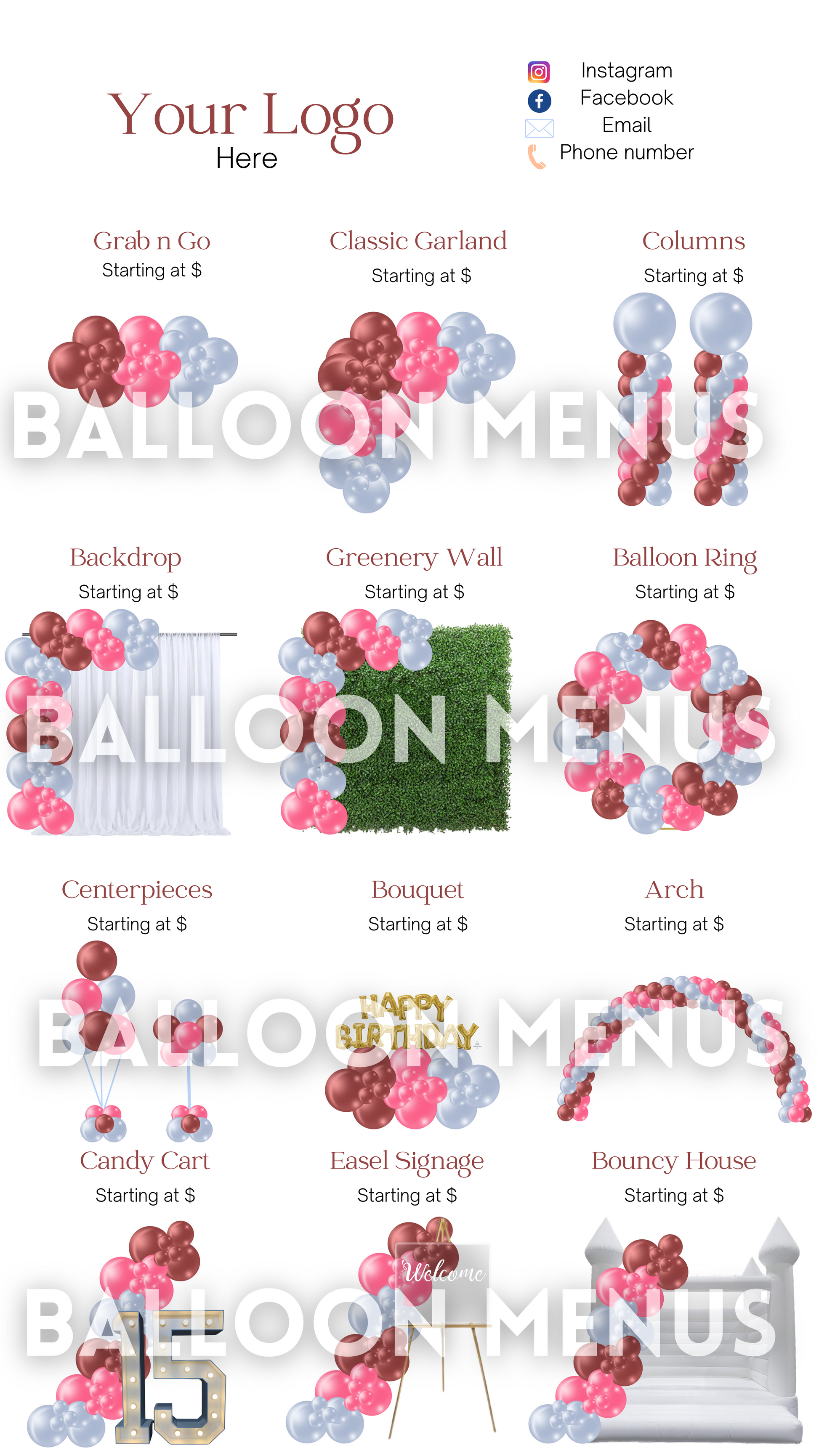 Premade Editable large Balloon Menu (Burgundy, Blue, Pink )