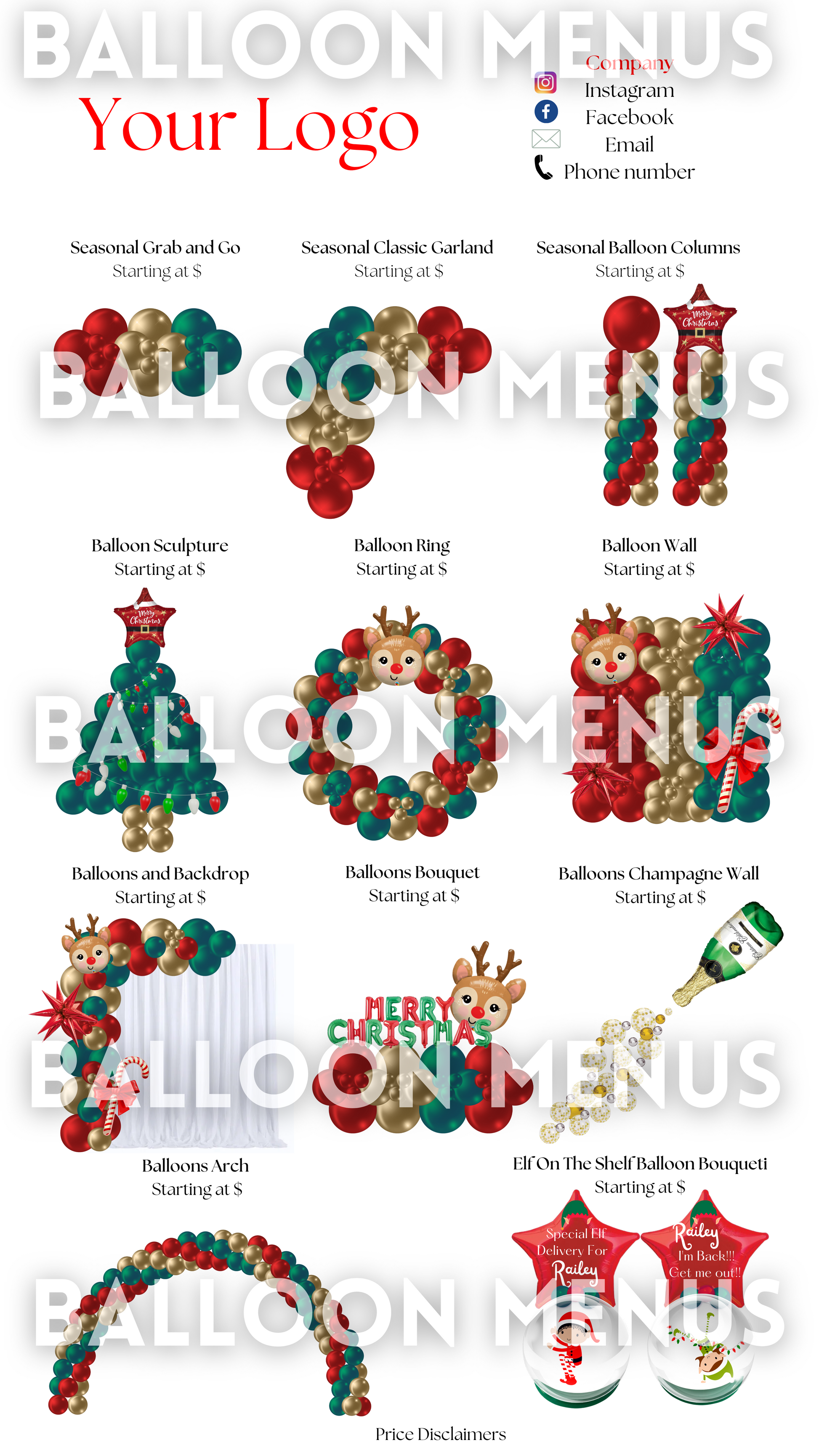 Premade Christmas Balloon Menu, Seasonal - Red, green, gold