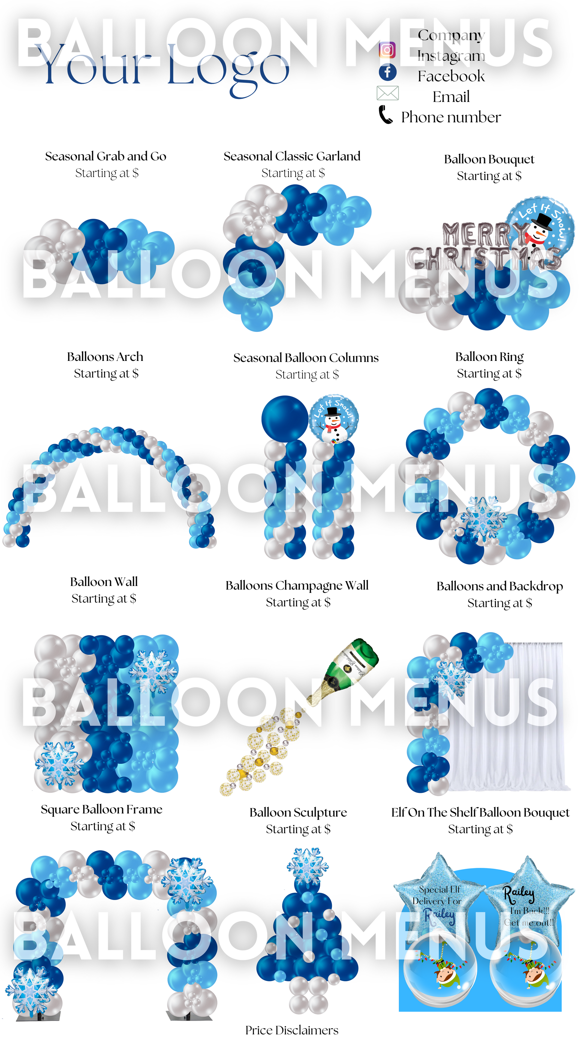 Premade Christmas Balloon Menu, Seasonal ( Blue and Silver)