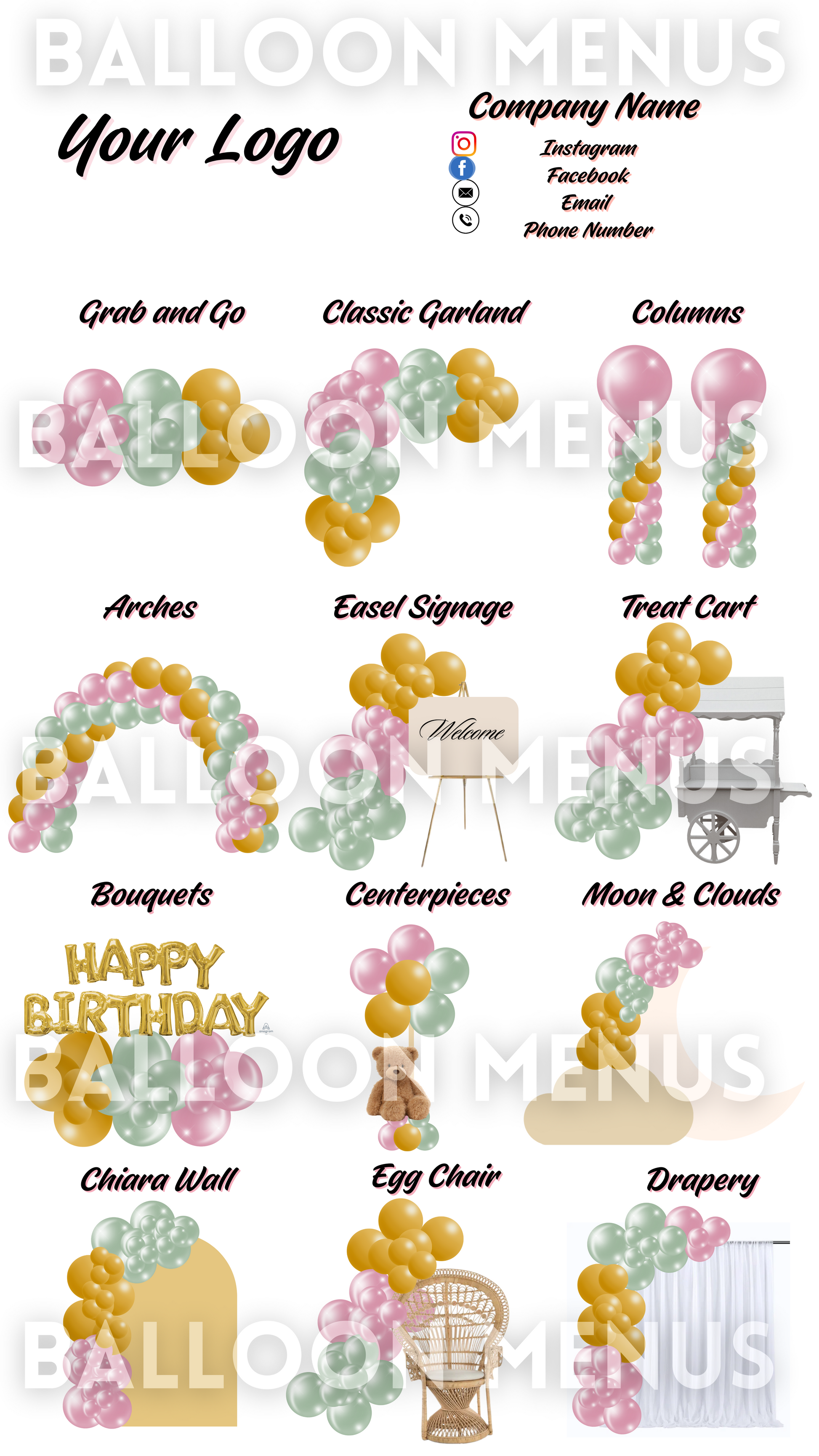 Make party planning easier and effortless with our Digital Balloon Menu! Designed to help party planners showcase their services and give clients a clear preview of offerings, this fully editable menu is a must-have tool for your business!