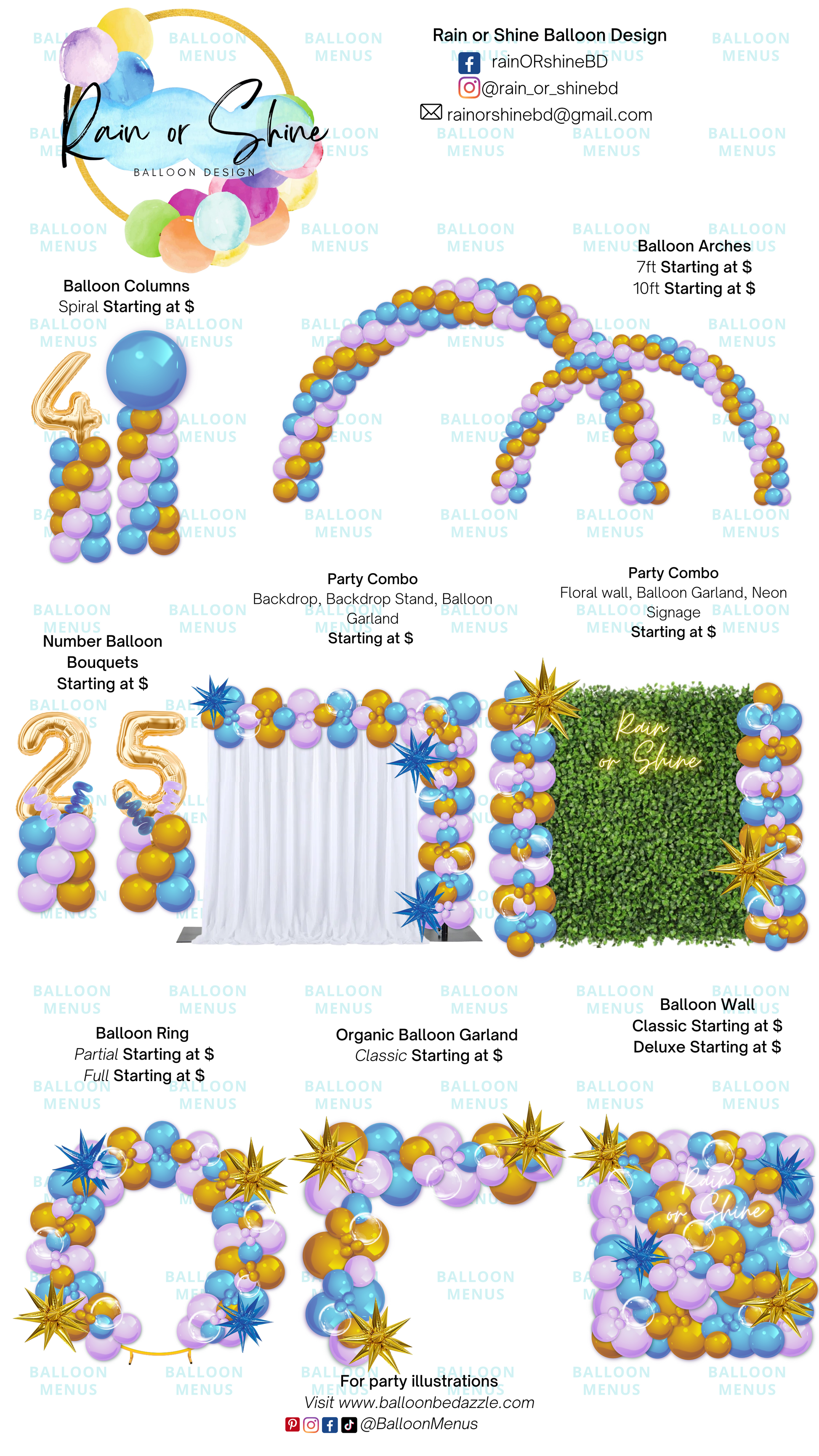 This is a custom, editable, downloadable balloon menu made specially for Rain Or Shine Balloon Design and is not for retail