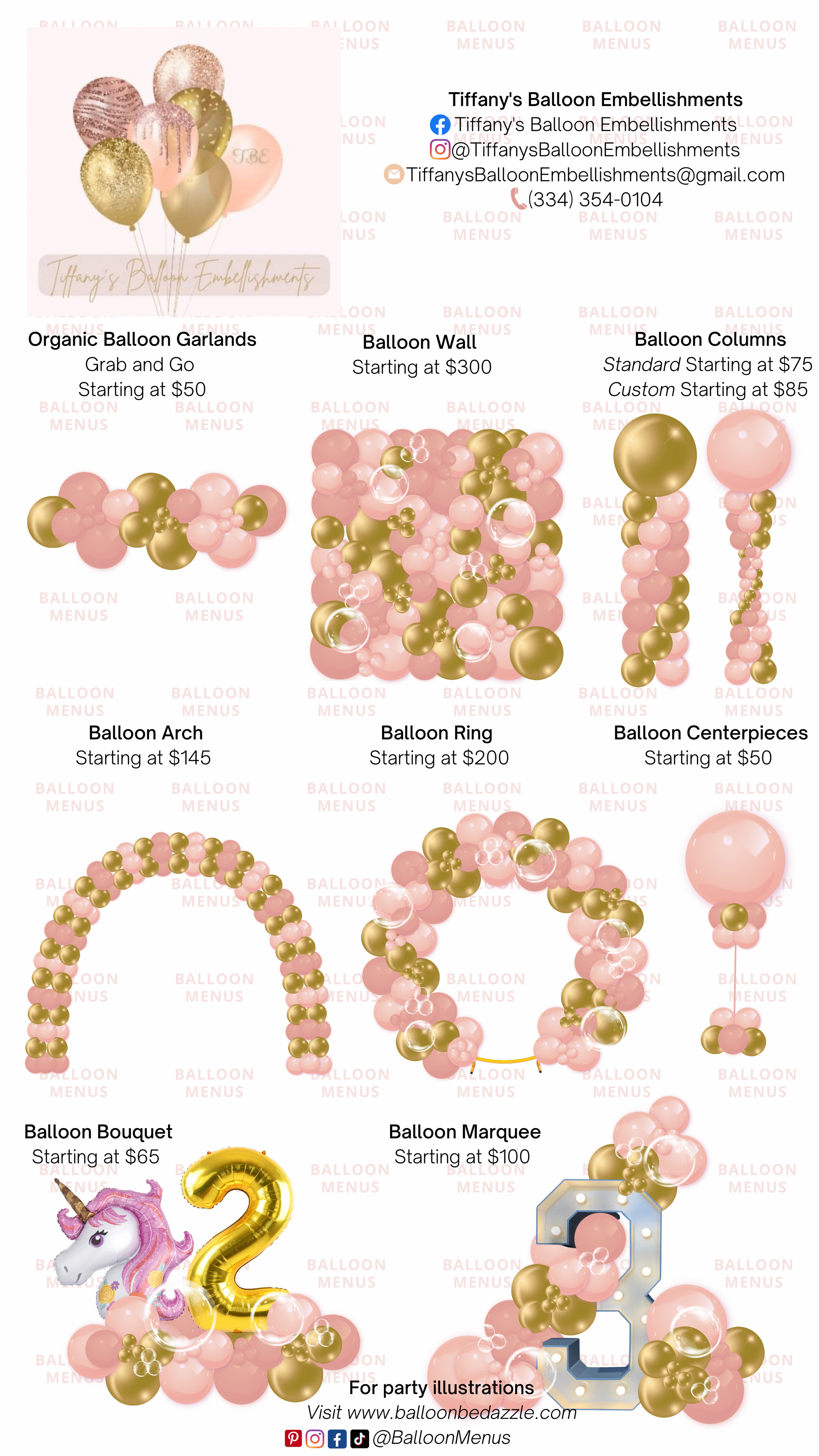 This is a custom, editable, downloadable balloon menu made specially for Tiffanys’s Balloon Embellishments and is not for retail