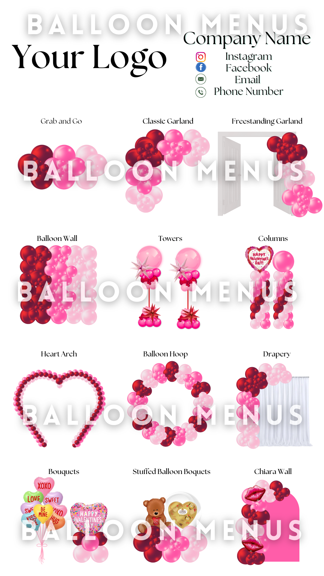 Valentine’s Day Seasonal Premade Editable Balloon Menu (Red and Pink)