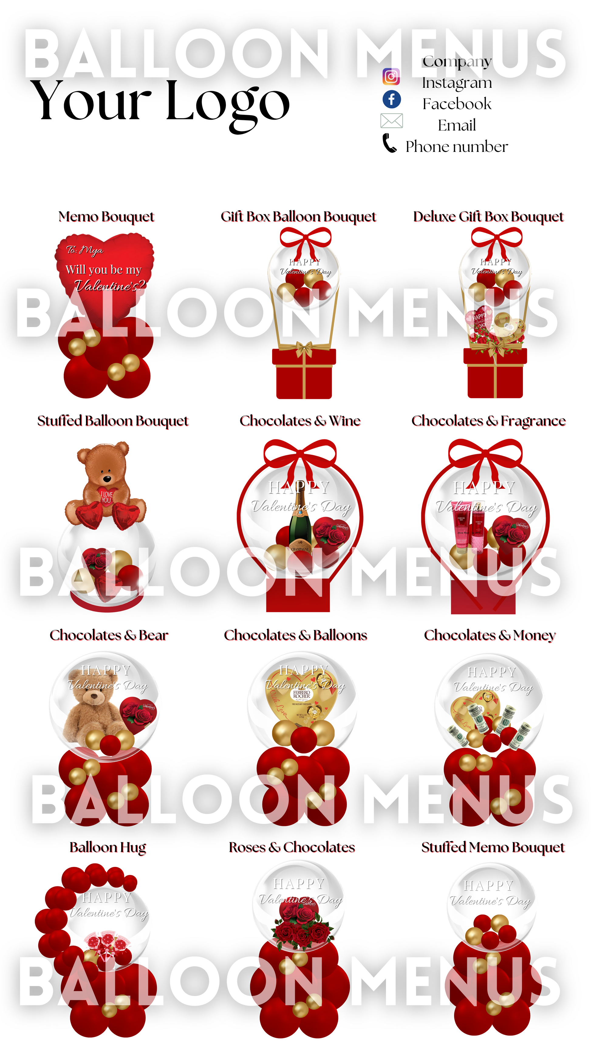 Valentine’s Day Seasonal Premade Editable Balloon Menu Stuffed Balloon Bouquets (Red and Gold)